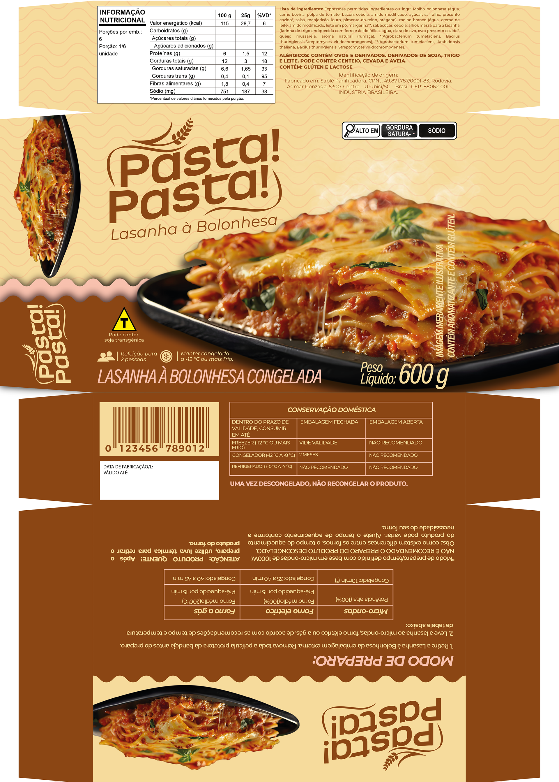 Uma embalagem acolhedora e apetitosa que evoca o conforto de uma refeição caseira. Com destaque para a imagem irresistível da lasanha fumegante, o design combina tons quentes, tipografia amigável e informações organizadas de forma prática e acessível. Ideal para atrair consumidores em busca de qualidade e conveniência, a embalagem reflete a essência da marca, promovendo uma experiência visual e funcional que valoriza o produto.