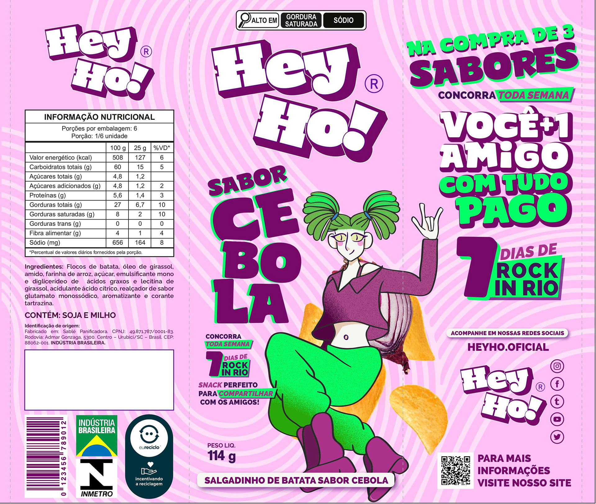 Uma embalagem vibrante e divertida que reflete a energia do público jovem. Com destaque para o sabor cebola, o design integra ilustrações únicas, tipografia ousada e uma paleta de cores chamativa, transmitindo autenticidade e modernidade. Ideal para promover uma experiência leve e descontraída, além de engajar com promoções exclusivas que conectam o produto ao universo cultural.